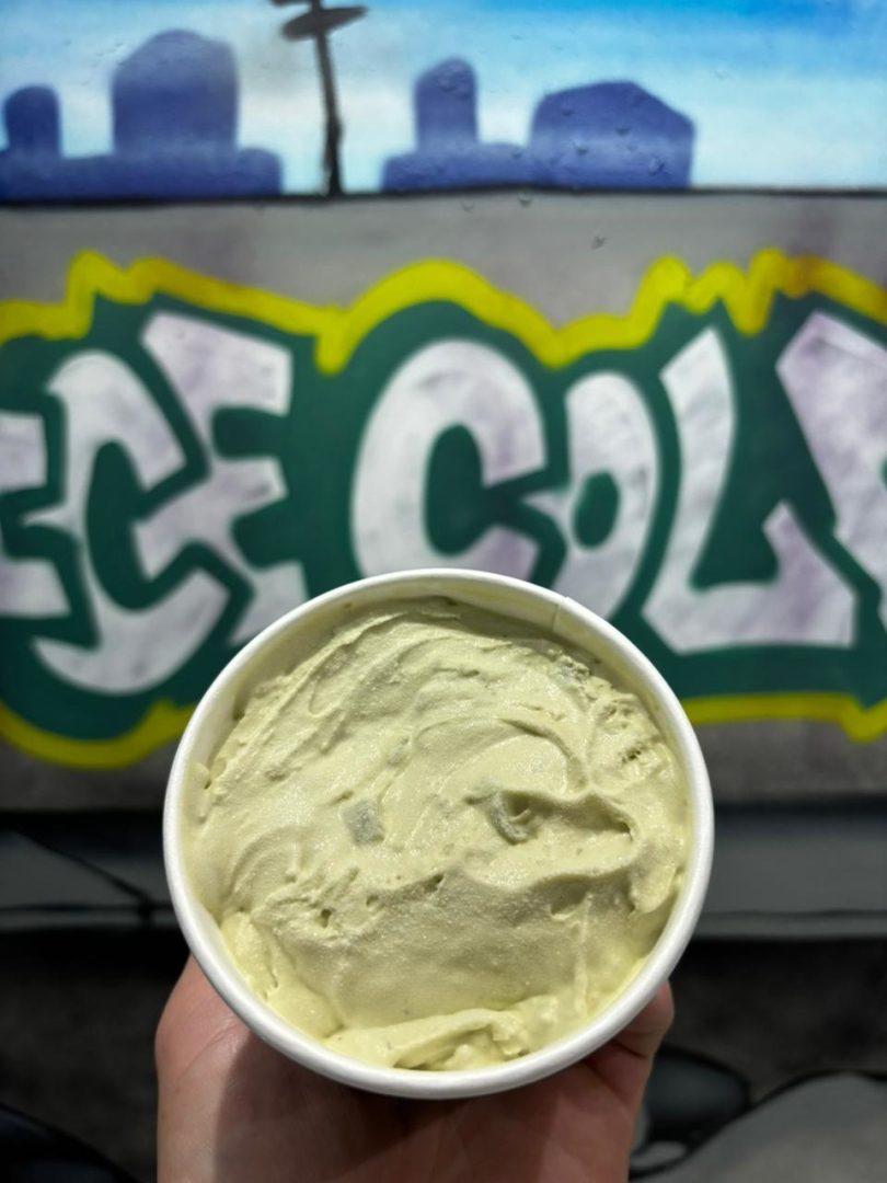 Um sorvete extremamente cremoso, Com sabor Intenso de pistache com Pasta feito da própria Pistache in Natura , e uma Mescla de pistache trufado no meio irresistível